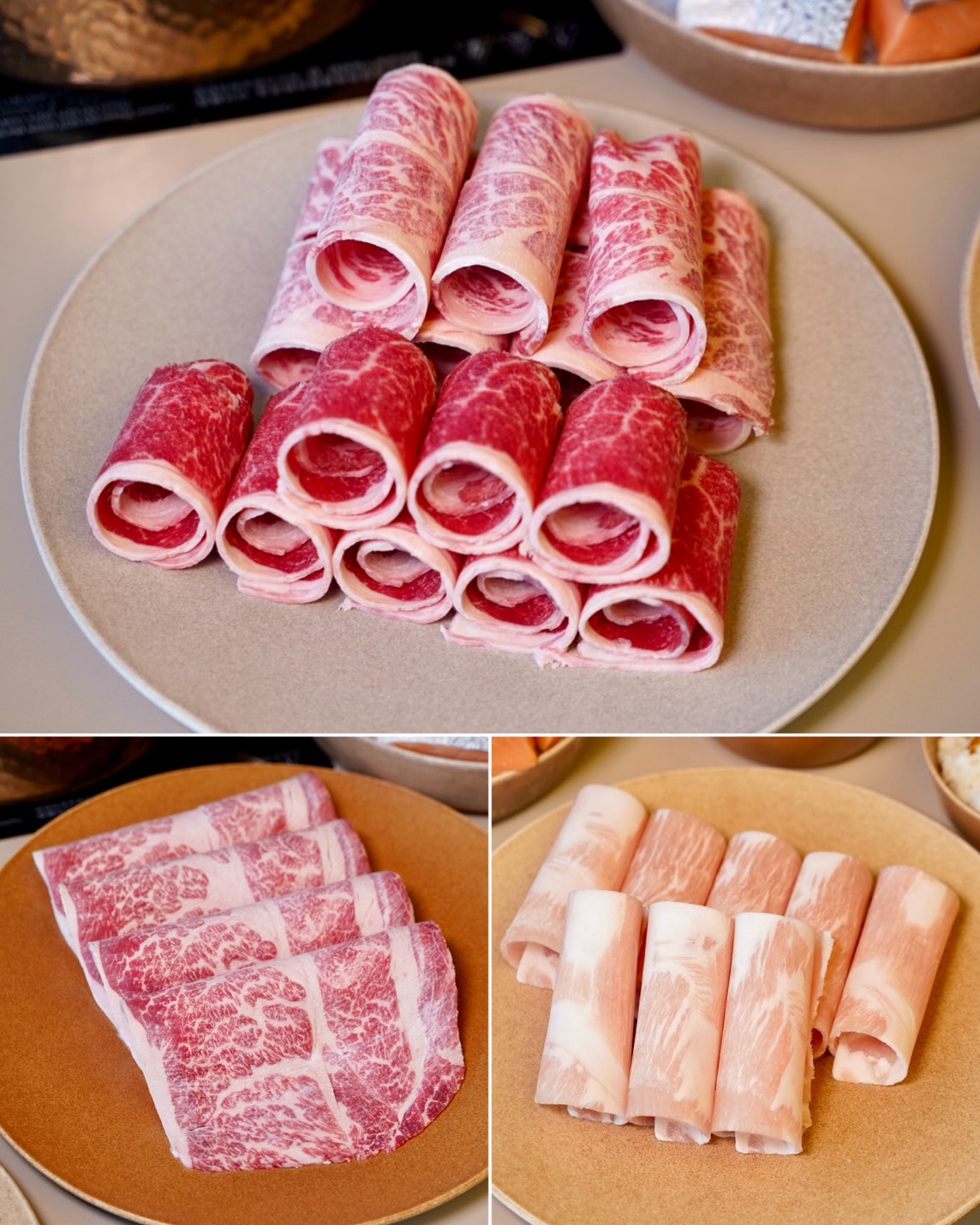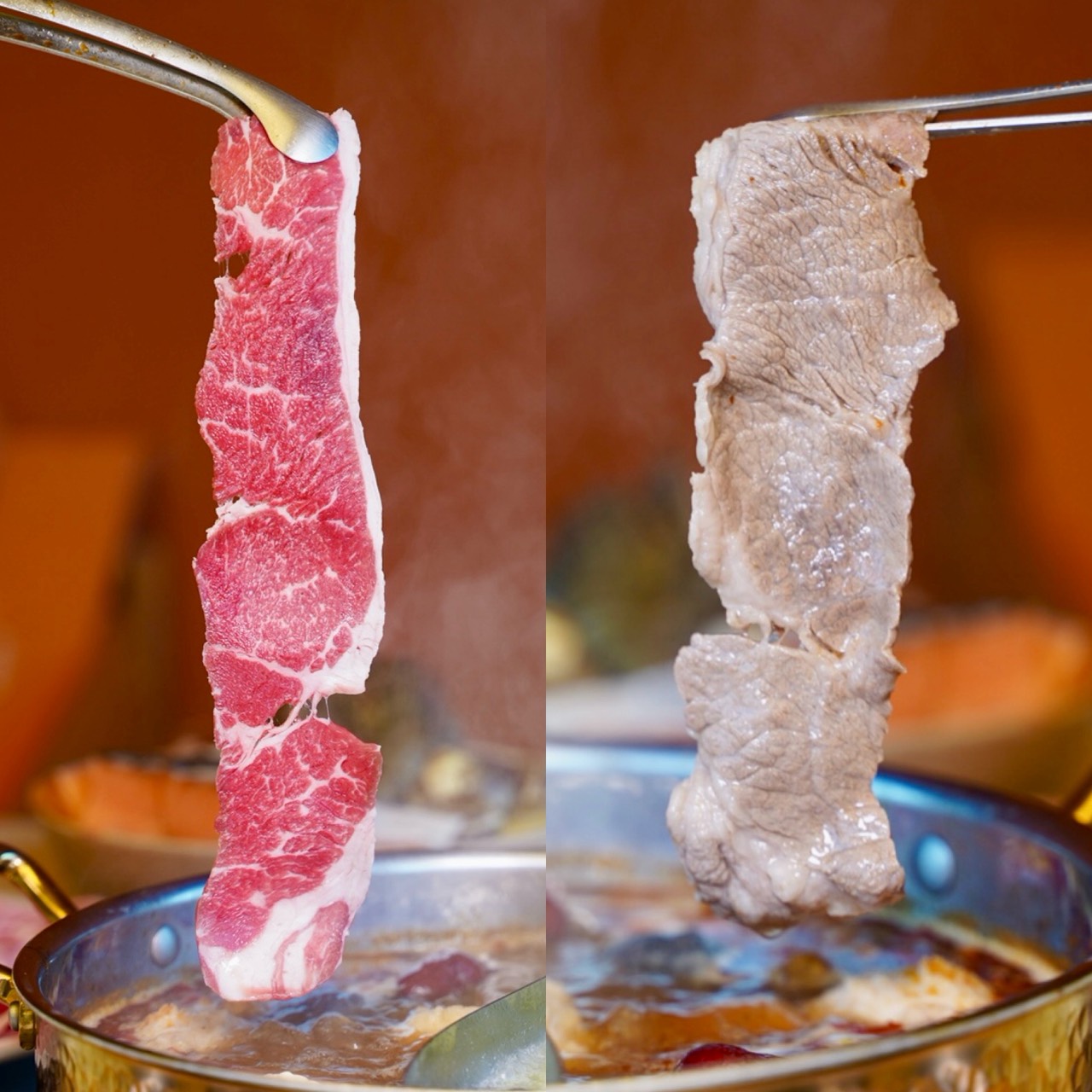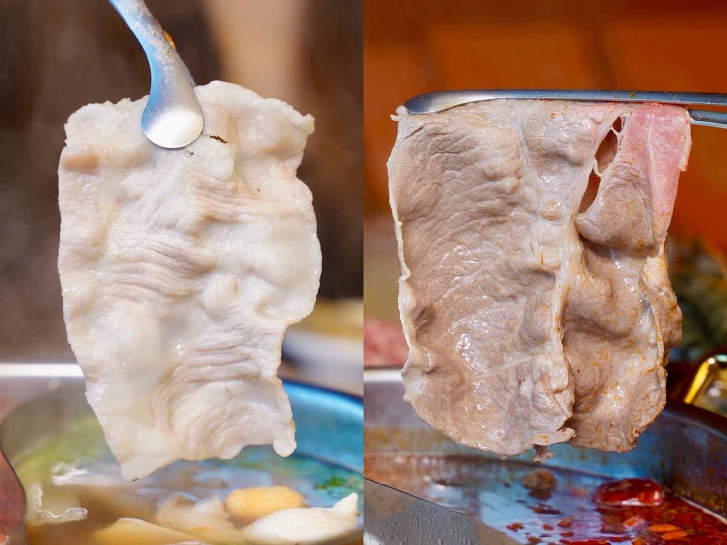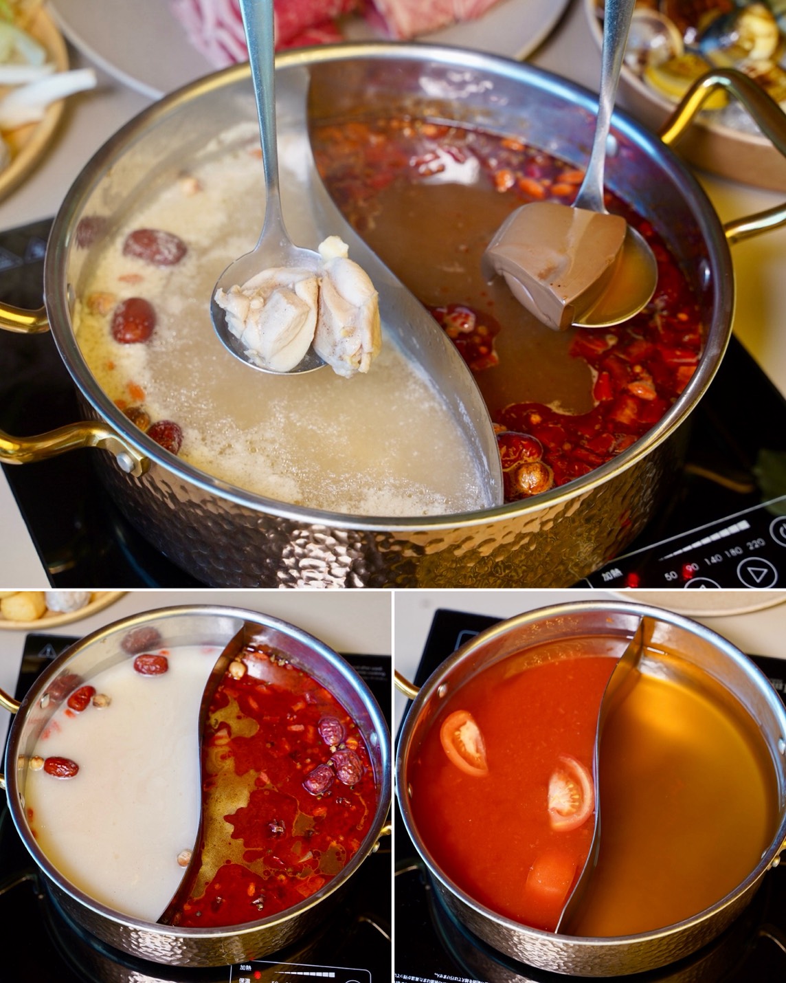 每個人來用餐都有鴛鴦鍋底能獨享,六種湯頭可以任選二種,不想額外加價,可以選擇昆布及藥膳鍋。「秘伝昆布」雖然不用額外加錢,但喝起來就很甘甜好喝,涮肉煮菜都很適合!加價升級的「粤式胡椒豬骨」,乳白色湯頭帶點微微胡椒辣度,裡頭的雞肉塊還能免費續一次,重點是不會越煮越鹹。「番茄美人」光看這紅通通的色澤,就知道非常夠味!使用大量蕃茄以及蔬菜熬煮出來,散發出天然的酸甜,完全沒負擔感。「頂級花椒麻辣」是主打可以喝的麻辣湯底,不會有油膩感,辣度及麻度都很剛好,裡頭有附一份鴨血,吃完可以免費續一次。