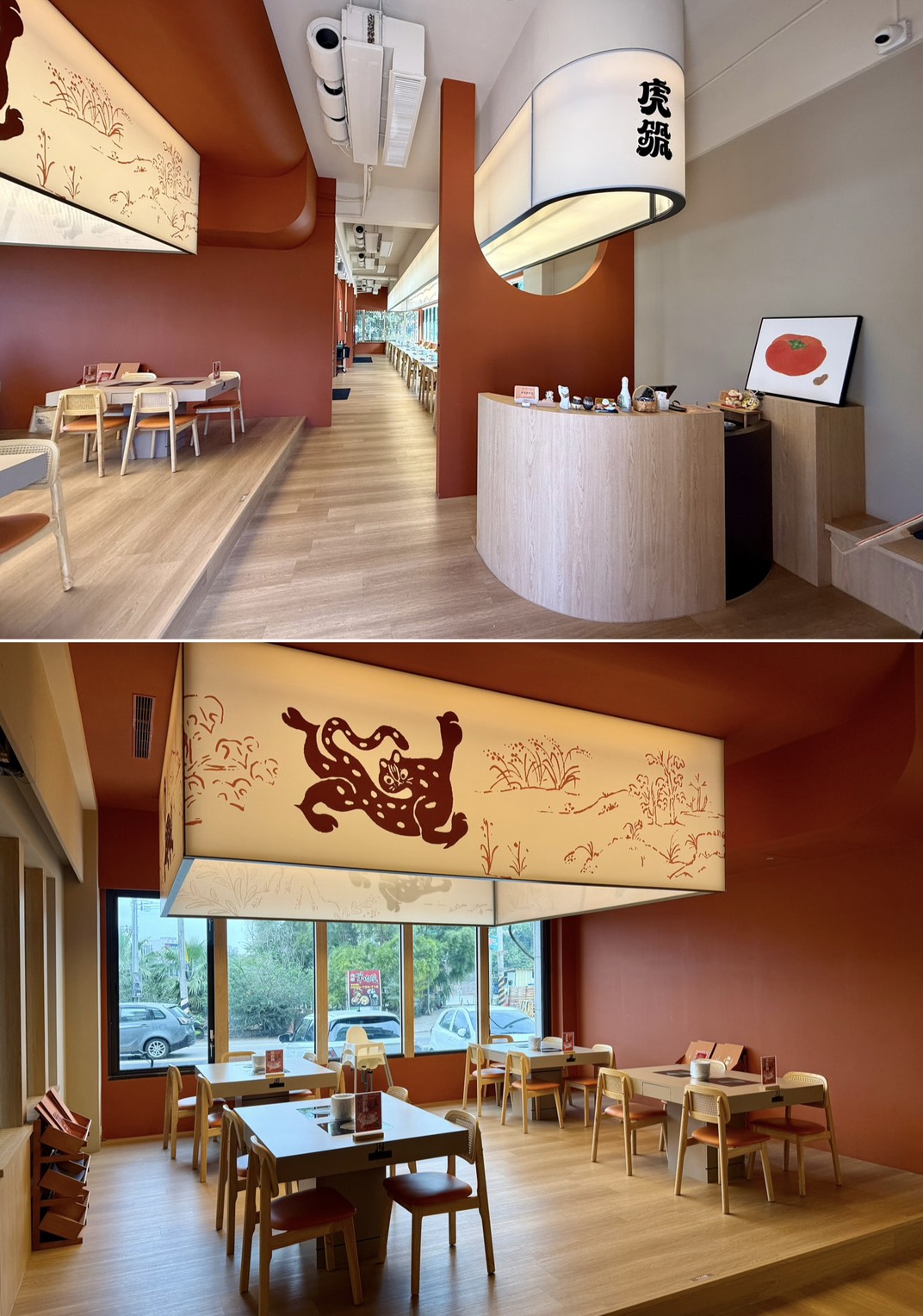 店內更是不得了,木質調結合大地色系,加上大片落地窗,空間寬敞明亮,整體氛圍暖到不行,店LOGO的圖案是苗栗特有的石虎,整個很有設計感。內用座位以四人座位為主,並以一人一鍋方式供應,自助吧動線流暢不擁擠,用餐起來非常舒適。