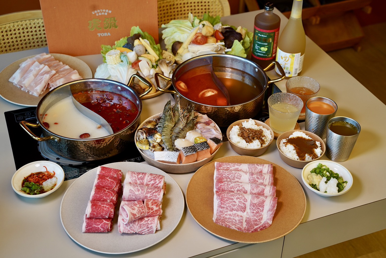 每個人來用餐都有鴛鴦鍋底能獨享,六種湯頭可以任選二種,不想額外加價,可以選擇昆布及藥膳鍋。「秘伝昆布」雖然不用額外加錢,但喝起來就很甘甜好喝,涮肉煮菜都很適合!加價升級的「粤式胡椒豬骨」,乳白色湯頭帶點微微胡椒辣度,裡頭的雞肉塊還能免費續一次,重點是不會越煮越鹹。「番茄美人」光看這紅通通的色澤,就知道非常夠味!使用大量蕃茄以及蔬菜熬煮出來,散發出天然的酸甜,完全沒負擔感。「頂級花椒麻辣」是主打可以喝的麻辣湯底,不會有油膩感,辣度及麻度都很剛好,裡頭有附一份鴨血,吃完可以免費續一次。