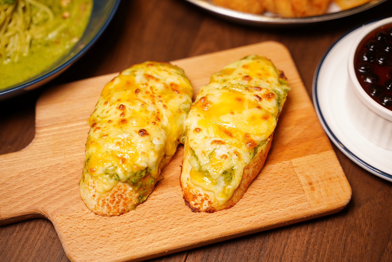 「主廚麵包」可以單點,也能用升級套餐吃到,是軟法塗滿羅勒醬,最後撒滿起司下去烤,吃起來鹹香開胃。