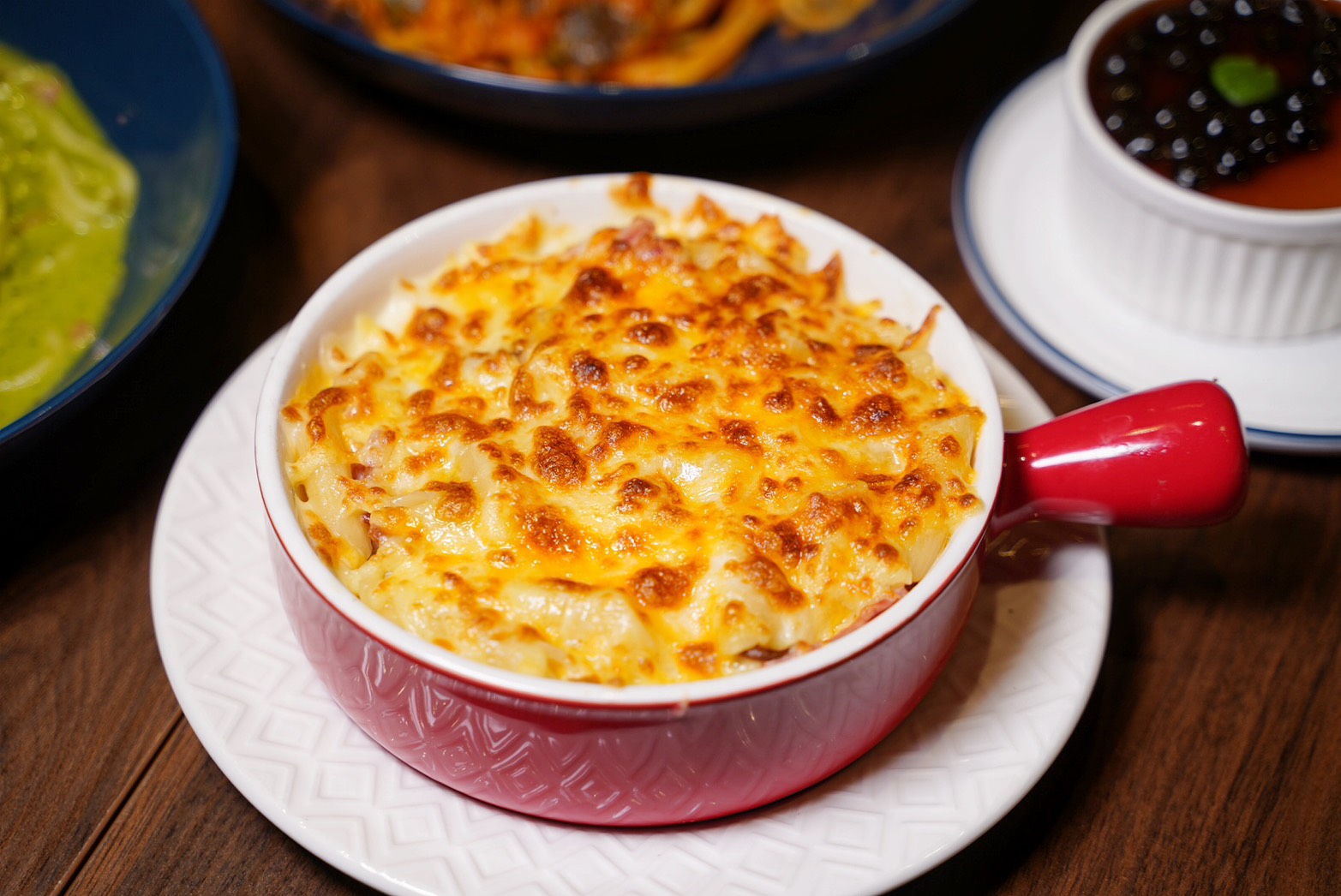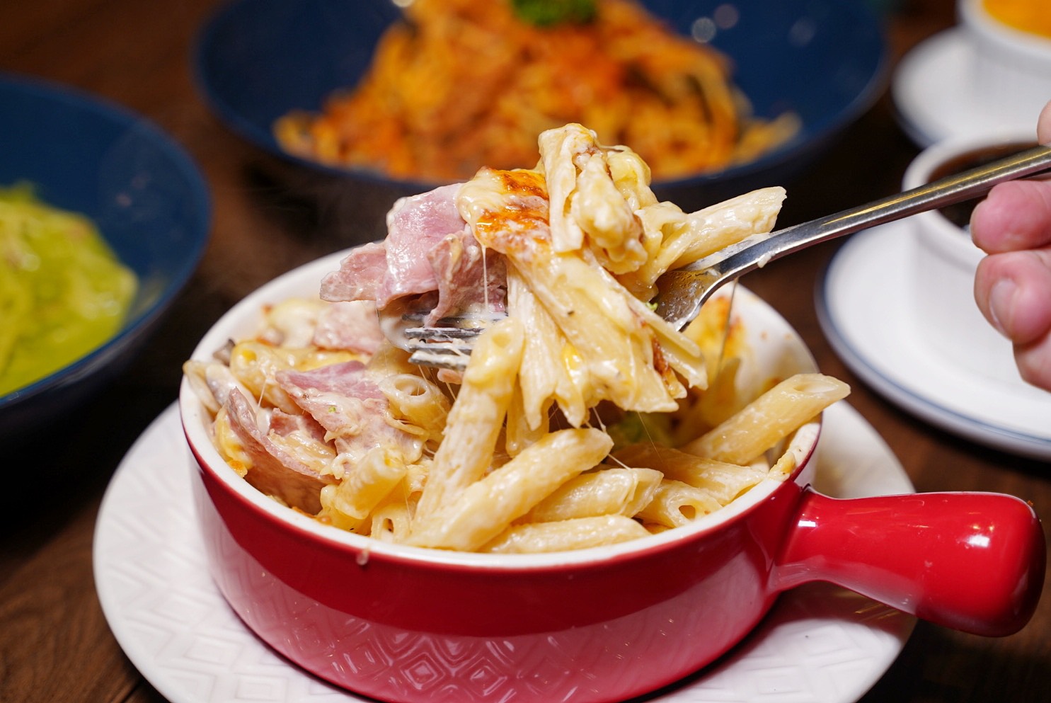 「焗烤奶油雙菇培根麵」熱騰騰端上桌還會牽絲,很喜歡筆管麵的Q彈口感,每一口都吃得到香濃奶香以及鹹香培根,絕對是大人小孩都會愛的滋味。