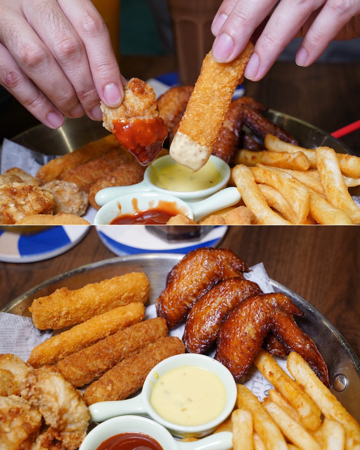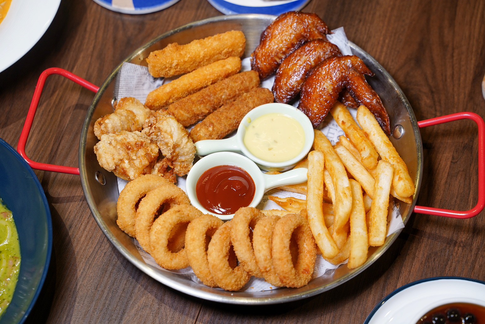 「打鐵拼盤」讓你六種炸物一次滿足!乳酪條熱熱吃還會牽絲,和風唐揚炸雞肉質超級嫩,比較特別是還吃得到鱈魚條,外皮薄脆,咬下去是厚實的魚肉,還蠻好吃的,其他還有薯條、烤雞翅以及洋蔥圈,超適合人多聚餐來上一份。