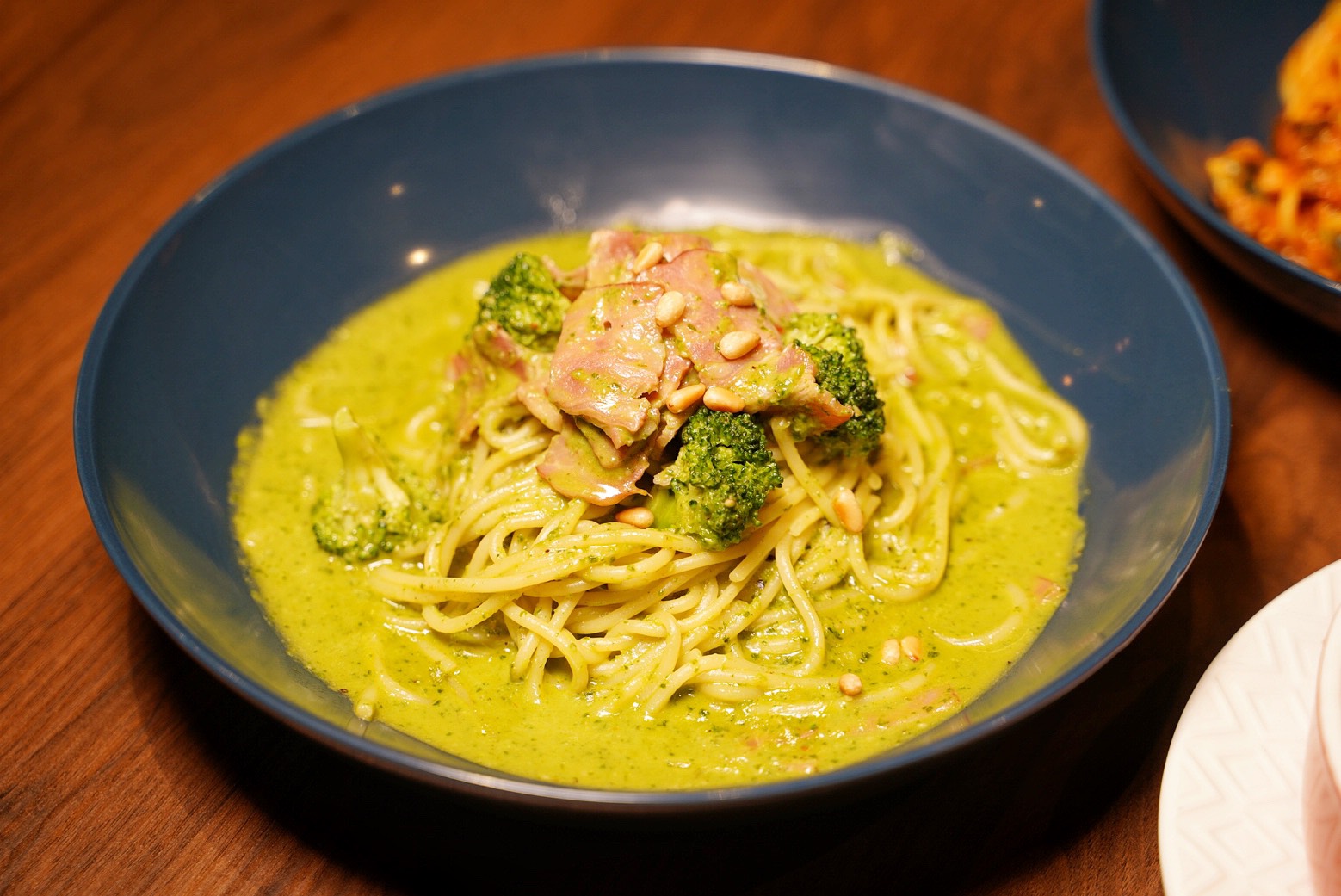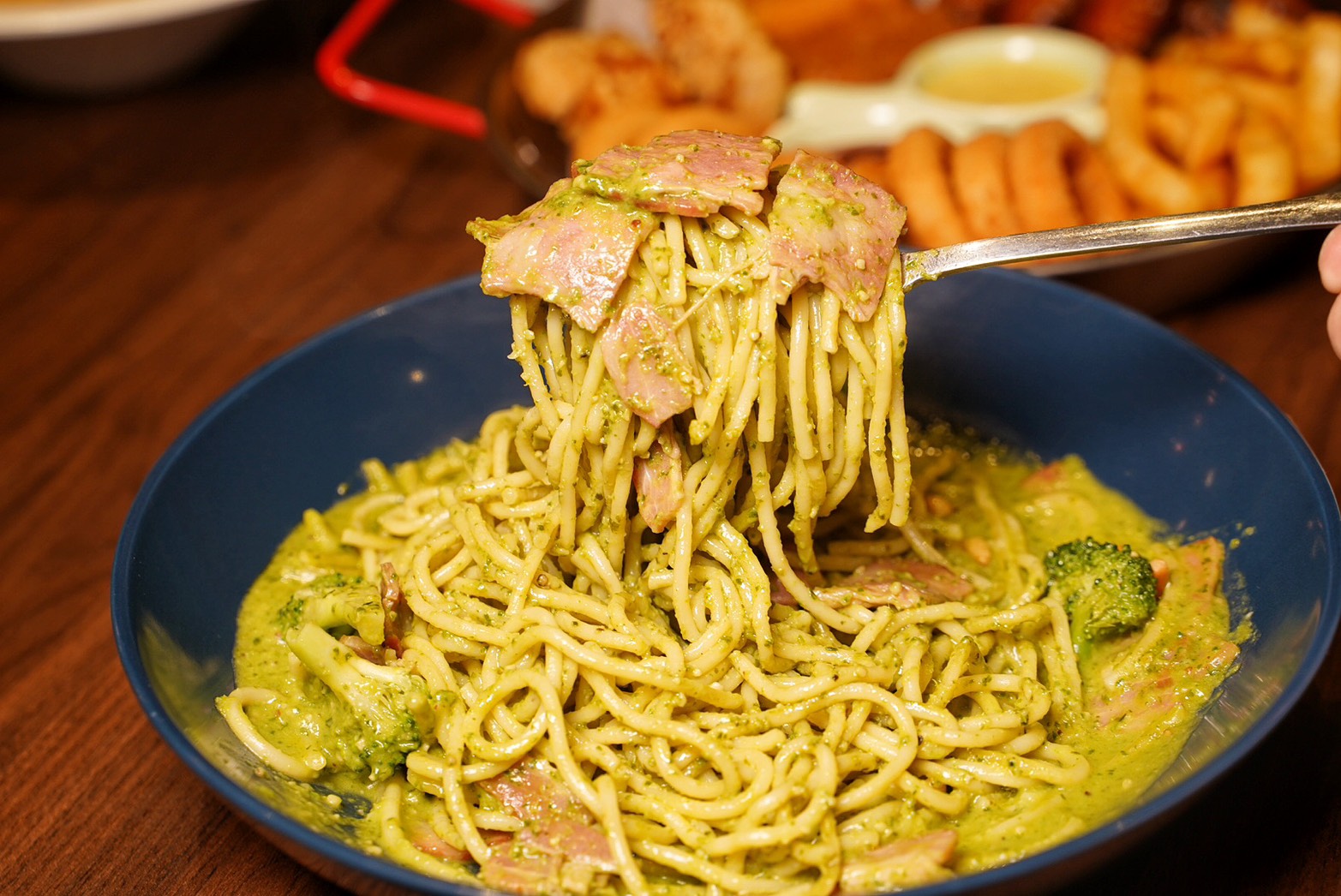 「松子青醬培根麵」入口的青醬味濃郁到不行~真的吃得到整顆松子藏在裡面,培根也給的不少,雖然平價但用料非常實在!