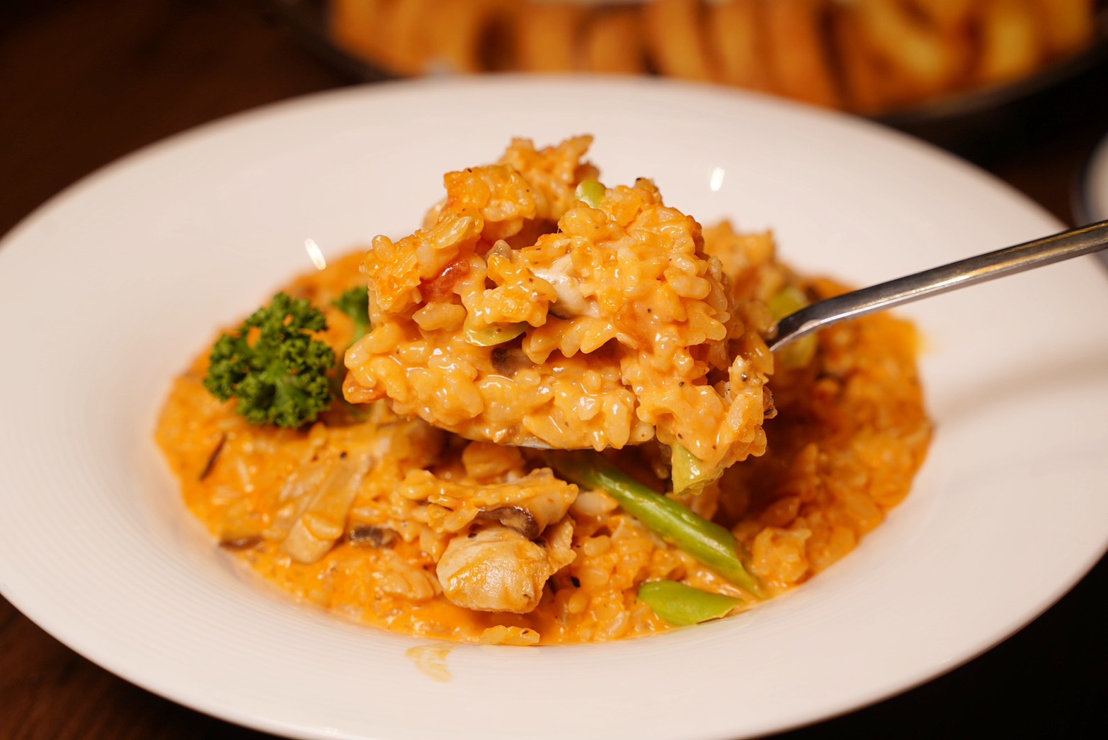 「橘醬嫩雞燉飯」紅醬的微酸與白醬的奶香交織在一起,入口還帶點蒜香提味,整體味道更豐富多層次,雞肉跟香菇的量也很有誠意,燉飯熟度也剛剛好,不會爛爛的,沒想到燉飯也蠻有水準的,不想吃麵的朋友,燉飯可以試試。