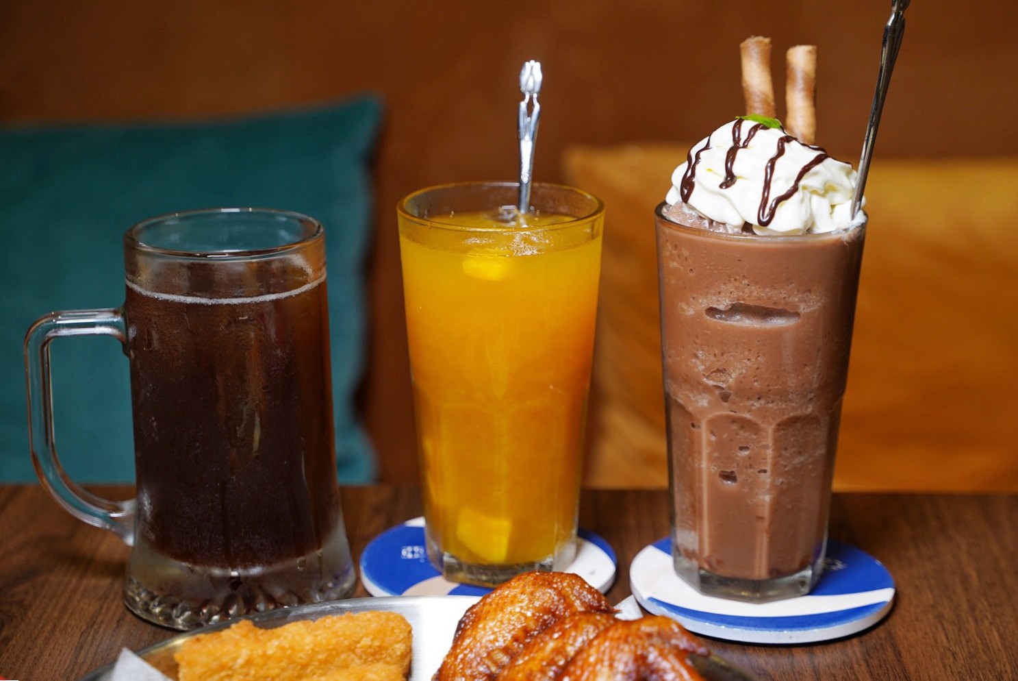 凡點主餐,都會免費附上一大杯古早味紅茶或綠茶,更換飲料可折價$40元。「芒果綠茶」喝得到新鮮芒果果肉,酸酸甜甜超解膩~「巧克力冰沙」還擠上鮮奶油及巧克力醬,絕對是小朋友會喜歡的口味。