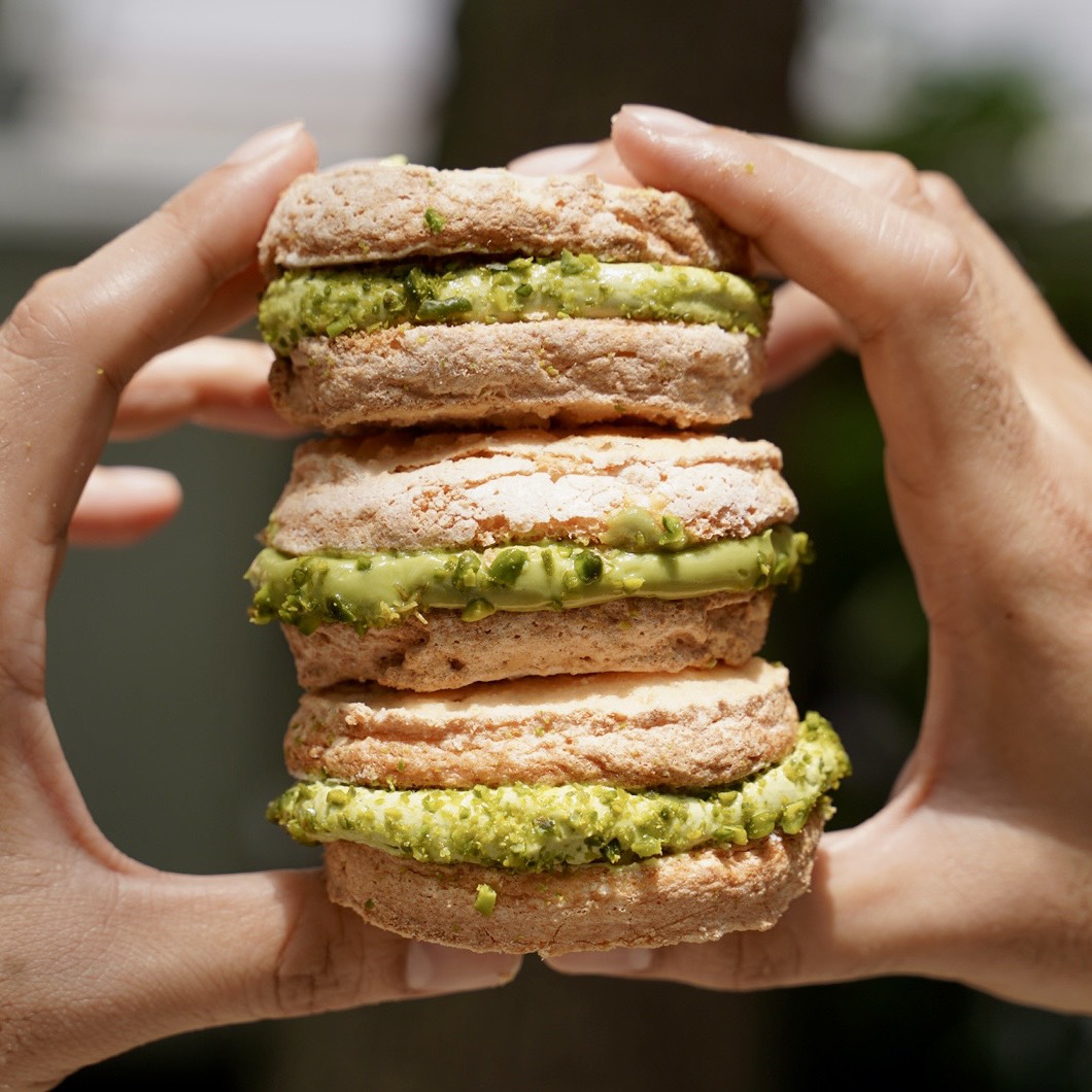 超厚「開心果達克瓦茲」第一次吃就被徹底圈粉!光是尺寸就比別家大上一倍,那種用心製作的手工感一眼就看得出來,外圈裹滿開心果碎粒,看起來超厲害!