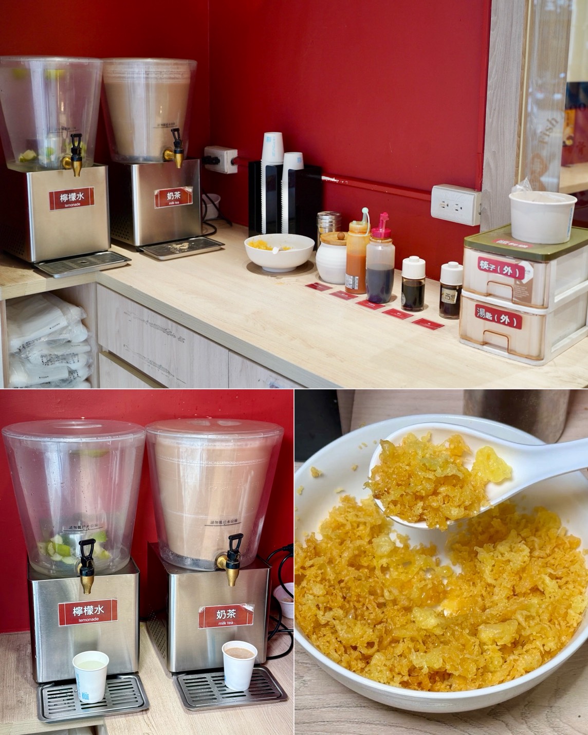 自助吧區有奶茶、檸檬水可以喝到飽,如果有夾關東煮或是天婦羅,記得來這裡裝醬料,另外還有炸屑屑可以加在湯麵裡,可以增添口感及香氣。