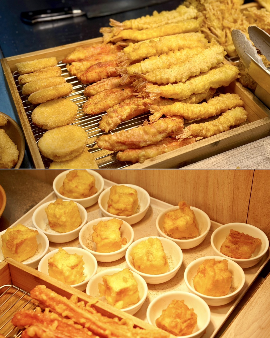 半開放式廚房設計,可以直接看到師傅現場現炸天婦羅,採自助式方式,十多種選擇,想吃什麼自己夾,而且20元起就能吃到~