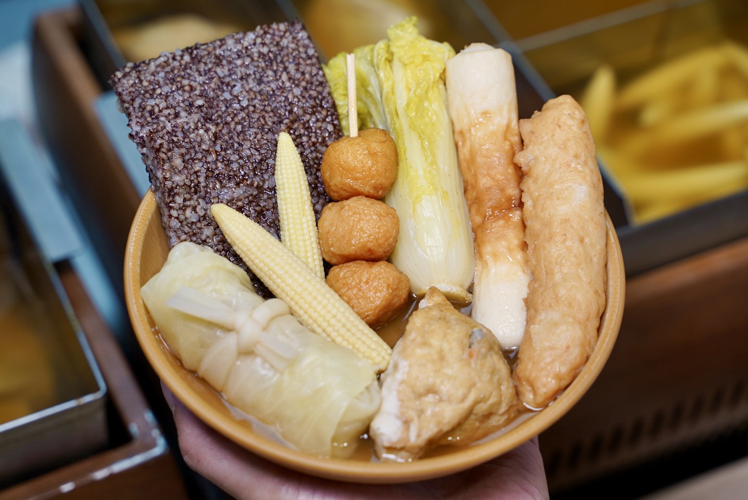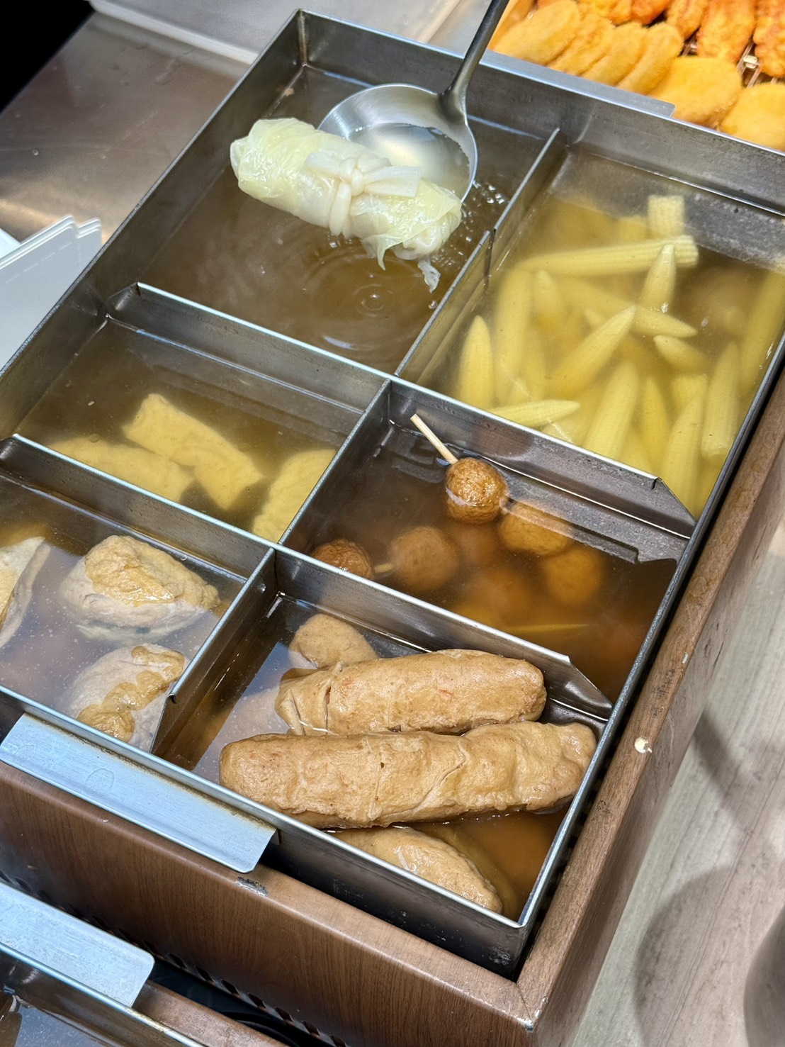 關東煮選擇還不少,有黃金魚蛋、米血、玉米筍、黑輪、淡水阿給、高麗菜捲、娃娃菜等等,想吃的基本款通通有,想吃什麼就夾什麼~