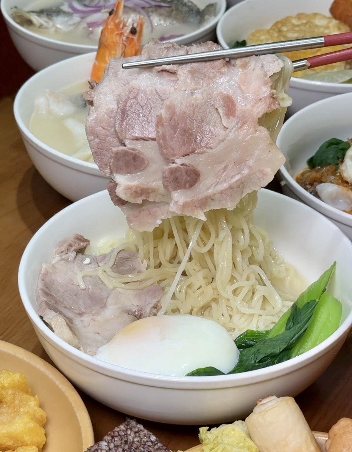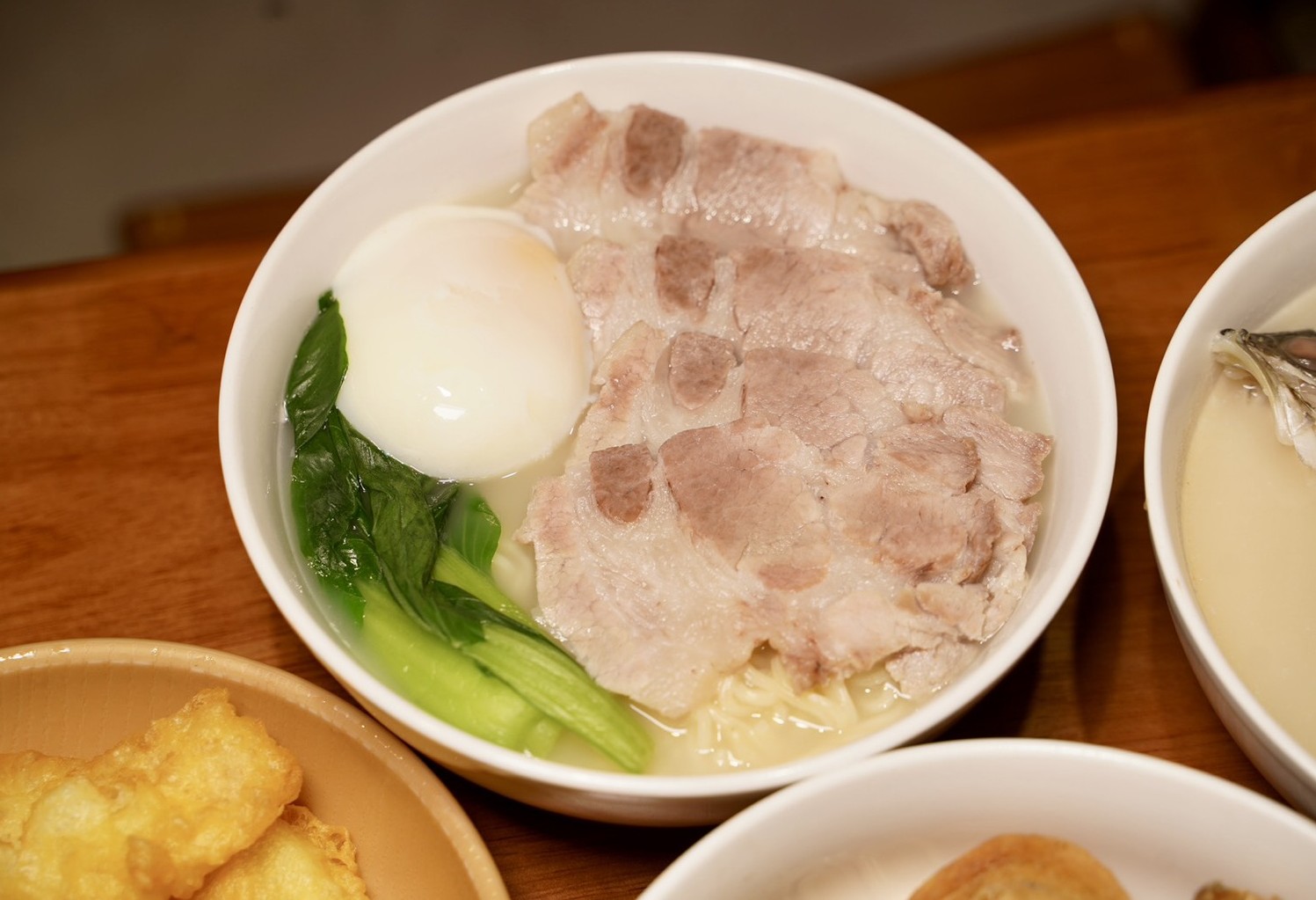 這碗「現宰溫體豬肉麵」很像釜山豬肉湯飯,只是把飯換成麵,湯頭是乳白豚骨系,把水波蛋拌進去,喝起來更濃郁,白切肉Q彈又多汁,吃完也很有記憶點。