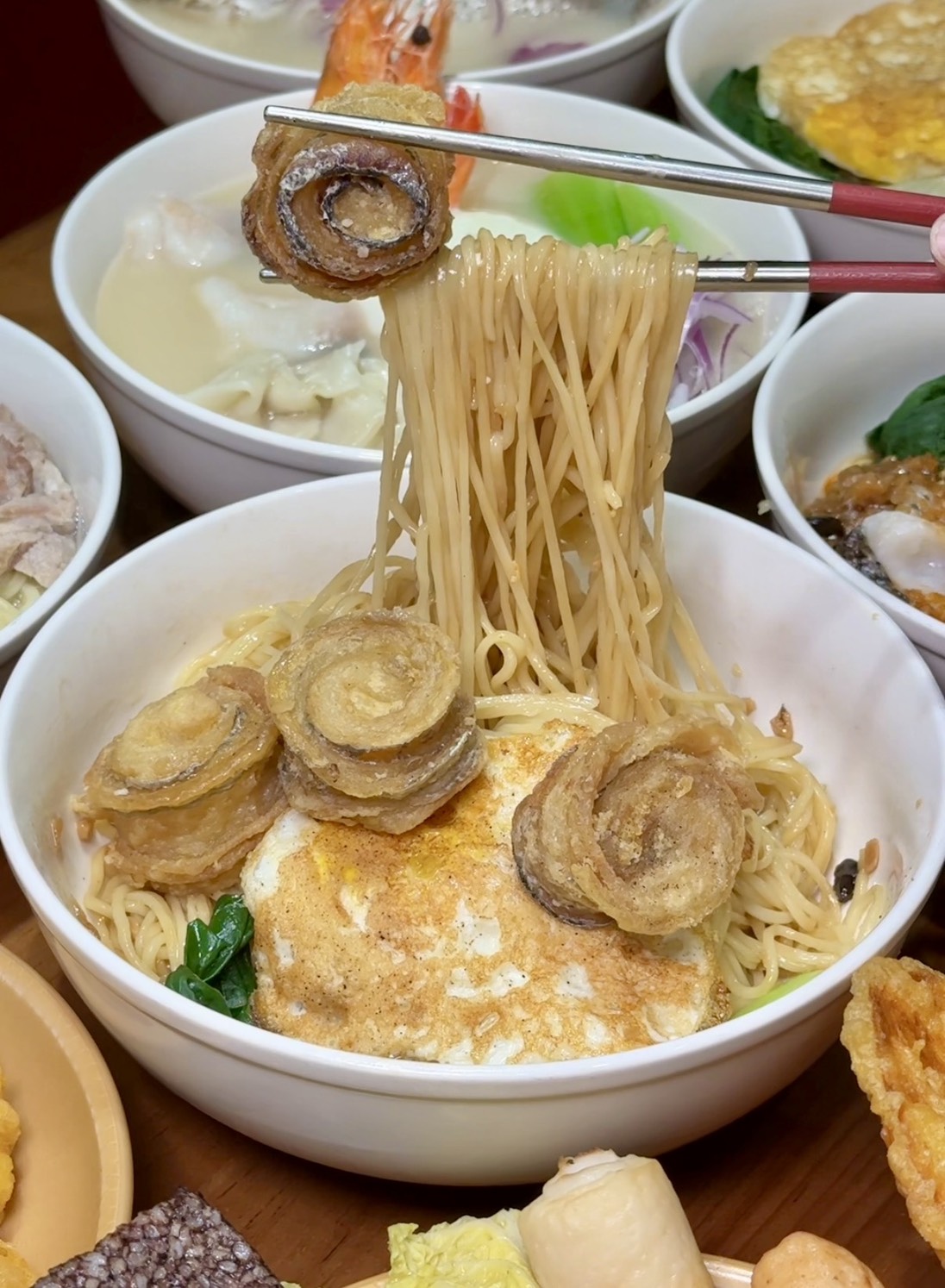如果不喜歡湯麵,也有很多乾拌麵能選擇,像是這碗「白帶魚捲乾拌麵」,有淋上蒜蓉醬,還帶有黑豆豉鹹香,非常古早味!白帶魚捲炸得外酥內軟,咬下去魚肉細到化開,還一次給你四個,吃完很滿足又有飽足感。