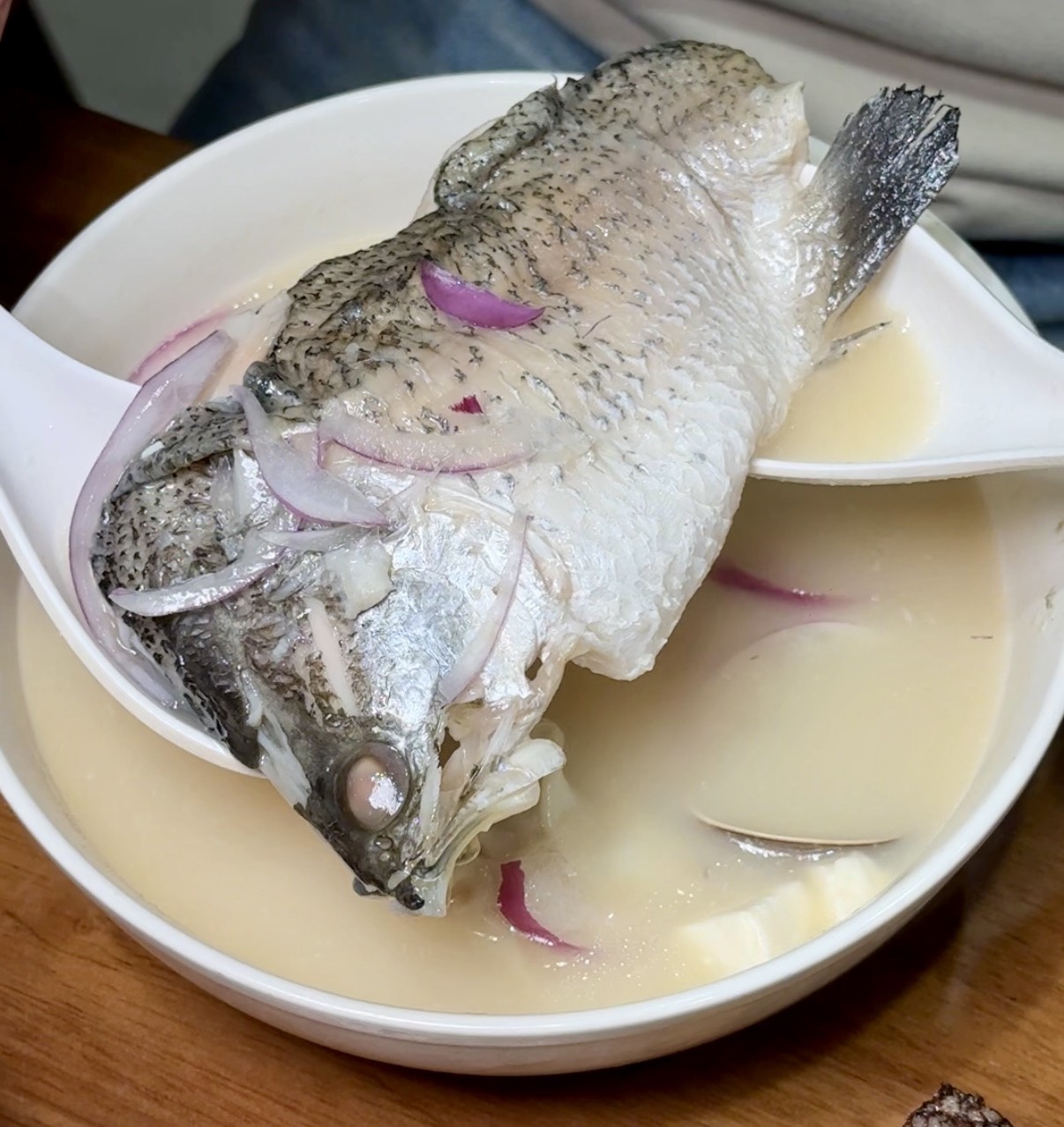 「金目鱸魚湯」直接豪邁放入半隻鱸魚下去熬煮,滿滿膠質感和蛋白質,滋補養身一碗就能搞定!